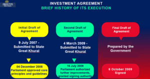 The Investment Agreement was concluded in full compliance with the laws and regulations of Mongolia as a result of extensive, long-term negotiations with the Government of Mongolia. Throughout the negotiation process, all relevant laws and regulations were fully complied with, and the negotiations were conducted under broad public and parliamentary oversight. |