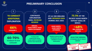 1. 24% of the Oyu Tolgoi deposit’s C-category resources are located in Hugo North, 20% in Hugo South, and 43% in the Heruga deposit. These areas represent the less-explored sections of the Oyu Tolgoi group deposit. We have planned phased exploration activities to upgrade the classification of C-category resources and improve confidence levels. Over the next five years, drilling will be conducted in Hugo North Lift 2 and Hugo South, while research work in the Heruga deposit is scheduled to begin in 2033. 2. We are currently updating the resource estimates for Hugo North and expect to deliver a revised resource report by 2026. 3. It is not feasible to conduct exploration across the entire Oyu Tolgoi group deposit simultaneously. Therefore, exploration is carried out in stages, starting with the most thoroughly studied areas, and mining operations proceed accordingly. As exploration progresses, resource classifications will be upgraded, and additional geological information on ore bodies located at depth will increase the volume of extractable resources. The figures of 73.5% and 48% cited in the inspector’s conclusion are based solely on the Feasibility Study 2023 (FS23) and the information we had available at that time. These figures will change as resource classifications are upgraded. |