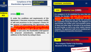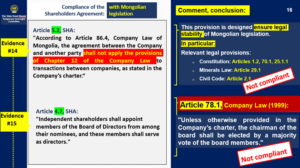 The experts concluded that the Shareholders’ Agreement lacked authorization from the State Great Khural, without providing any explanation of the legal basis on which such an agreement would require authorization from the State Great Khural, rendering their conclusion overly biased. The Shareholders’ Agreement is an agreement entered into between a company’s shareholders in accordance with the Company Law of Mongolia and is governed by the Civil Code. Therefore, there is no legal requirement for such an agreement to be discussed or authorized by the State Great Khural. |