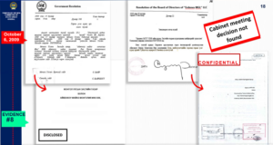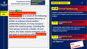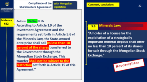 The Investment Agreement was executed with the signatures of the Minister of Finance, the Minister of Mineral Resources and Energy, and the Minister of Environment and Tourism as per Article 29.2, Minerals Law of Mongolia in force in 2009, which stipulates that an Investment Agreement shall be jointly executed by the Cabinet members responsible for finance, geology, mining, and environmental matters, upon authorization by the Government of Mongolia. While, under the Company Law, the Shareholders’ Agreement must be executed by the shareholders of the relevant company. Therefore, the Shareholders’ Agreement was duly executed by duly authorized representatives of the shareholders of OT LLC, and this does not constitute a violation of law. |