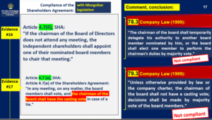 As explained above, the Shareholders’ Agreement (Amended and Restated Shareholders’ Agreement) is an agreement entered into between the shareholders of the company in accordance with the Civil Code. The parties to the agreement have mutually agreed on this arrangement as per Article 189.1 of the Civil Code, which provides that the parties to the agreement have the right to determine the content of the agreement themselves. With respect to negotiations involving a conflict of interest, this arrangement was included in the agreement in accordance with Article 86.4 of the Company Law in force at the time (currently Article 89.4), which permits specifying circumstances in which the provisions of Chapter 12 do not apply. Regarding Clause 4.7(a) referenced by the expert, the Shareholders’ Agreement (including the Amended and Restated Shareholders’ Agreement) and the Charter of OT LLC provide that the provisions of the Shareholders’ Agreement form an integral part of the Company’s Charter. In other words, because the law permits alternative arrangement in the Company’s Charter, the shareholders agreed to such terms. This is fully consistent with the laws of Mongolia. |