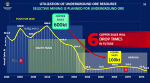 It is professionally unsound and one-sided to infer that variations in concentrate production, as shown in the presentation, reflect selective mining of underground ore or inadequate studies. In reality, Oyu Tolgoi’s operations are guided by phased exploration, integrated mine planning, and a risk-managed strategy. 1. The variations in copper concentrate production shown in the slides should be understood as indicative figures based on assumptions drawn from the Feasibility Study (FS) and mine planning documents available at the time. These figures are subject to change depending on subsequent geological study results, resource classification upgrades, and optimization of mining sequences. They should not be regarded as final or fixed conclusions. 2. The pattern of higher copper concentrate production in the early years followed by a later decline does not indicate selective mining of underground ore. Rather, it reflects the typical production curve commonly observed in large porphyry deposits. At the start of operations, blending high-grade ore from the open-pit Oyu deposit and the underground Hugo North deposit results in higher concentrate output. This is a geological reality, not a consequence of insufficient studies. 3. Throughout the mine’s life, the concentrator’s ore processing capacity has remained stable at approximately 40 million tons per year, demonstrating the consistency of mine and concentrator capacity, technology, and infrastructure. The decline in concentrate output is due to natural variations in ore grade, which is a geological condition, not a planning error. 4. Geological exploration and detailed studies currently underway at Hugo North Lift 2 enable phased preparation of C-category resources for extraction and provide opportunities to optimize mining sequences and update plans as needed. Therefore, the phased and systematic planning and implementation of studies and exploration at Lift 2 and other ore bodies is a strategic measure aimed at mitigating risks arising from geological uncertainty. It is unfounded to characterize these actions as “errors caused by delayed studies.” |