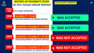 Oyu Tolgoi LLC prepared a detailed Feasibility Study (FS) for the open-pit mine and concentrator, as well as an order-of-magnitude study for the underground mine, which were reviewed and approved by the Mineral Resources Professional Council (MRPC) in 2010. Based on these approvals, project development and operational activities commenced in compliance with applicable laws and regulations. Subsequently, a detailed FS for the underground mine was developed in 2015, reviewed and approved by the MRPC, and became the primary reference document for underground operations. In accordance with FS requirements and relevant regulations, Oyu Tolgoi LLC has fulfilled its obligation to update the FS every five years, submitting official amendments to the MRPC in 2020 and 2023. As the holder of a mineral license, Oyu Tolgoi LLC has consistently met its responsibility to prepare and update the FS. The acceptance and approval of these FS documents and their amendments are determined by the MRPC through a formal review process in accordance with law and regulation. Therefore, the conclusion that “Oyu Tolgoi LLC has operated without an approved FS for the past 10 years” is inconsistent with legal requirements and actual practice. Rather, it reflects a misinterpretation of the procedural stages of MRPC review and decision making. |