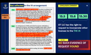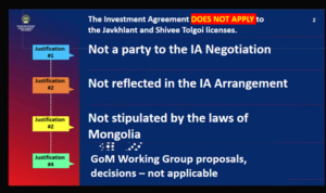 The justification for including the Javkhlant and Shivee Tolgoi licenses under the Oyu Tolgoi Investment Agreement has been clearly outlined above. On this basis, these licenses fall under the scope of the IA without the need for a separate request for inclusion. This explanation has previously been provided to the Interim Committee and the inspectors. However, the conclusion presented at the hearing appears to reflect a one‑sided interpretation of the matter. |