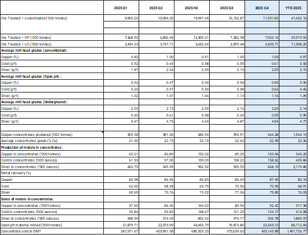 - In 2025, copper production increased by 61% and gold production by 121% compared to the previous year. These increases were driven by higher ore grades from both open‑pit and underground mining operations, as well as the completion and commissioning of major infrastructure projects, including the underground mine’s Second Primary Crusher, the concentrator’s Fifth Sag Mill, and the conveyer system.
